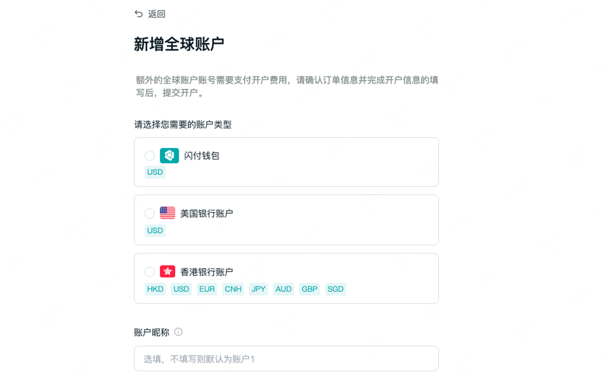 在【新增全球账户】页面,您可以根据账户说明与实际使用需要,选择需要新增的账户类型。