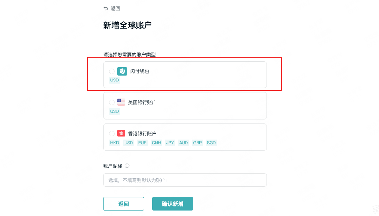 在【新增全球账户】页面,选择【闪付钱包】,点击确认新增,则闪付钱包新增成功。